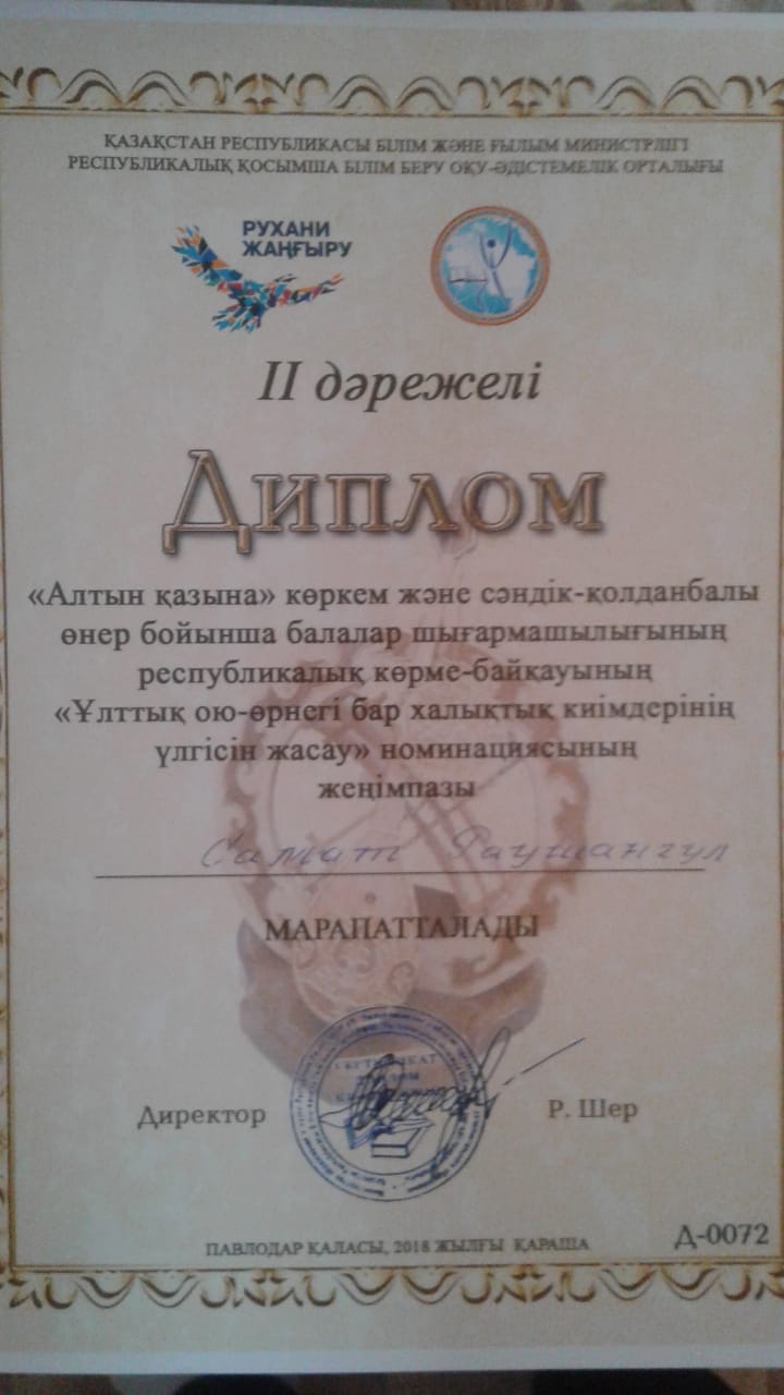 №23 жалпы орта білім беретін мектептің 11 "А" сынып оқушысы Саматова Раушан Саматқызы Павлодар қаласында өткен «Алтын қазына» балалар шығармашылығының көркем және сәндік-қолданбалы өнер республикалық байқау-көрмесіне қатысып, "Ұлттық ою-өрнегі бар халықтың киімдерінің үлгісін жасау" номинациясы бойынша жүлделі ІІ-орынды иеленді.